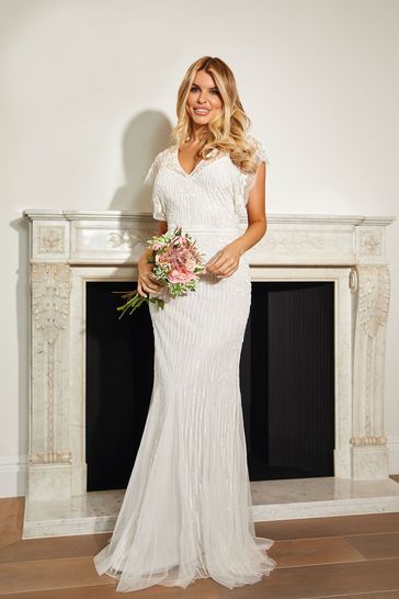 Sistaglam White Beaded Sequin Maxi Dress with Frill Sleeve