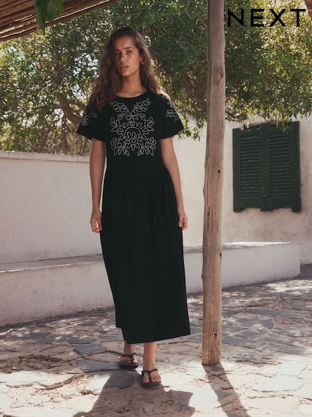 Black / Ecru Embroidered Jersey T Shirt Dress
