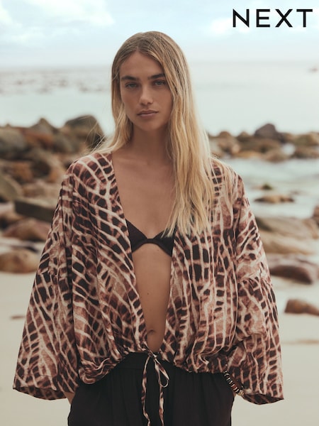 Sosandar Brown Tie Waist Fluted Sleeve Beach Kaftan