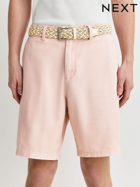 Pink Belted Cotton Linen Blend Shorts
