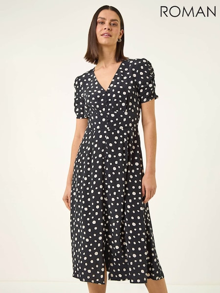 Noir - Peignoir mi-long Roman à pois et manches froncées