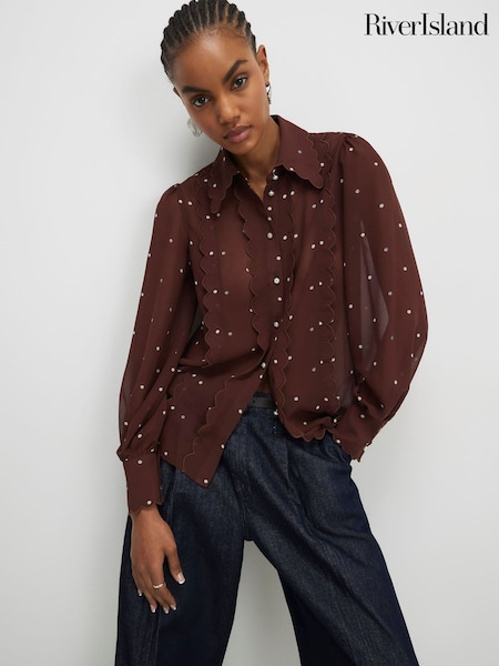 River Island Long Sleeve Scallop Hem Polka Dot Shirt