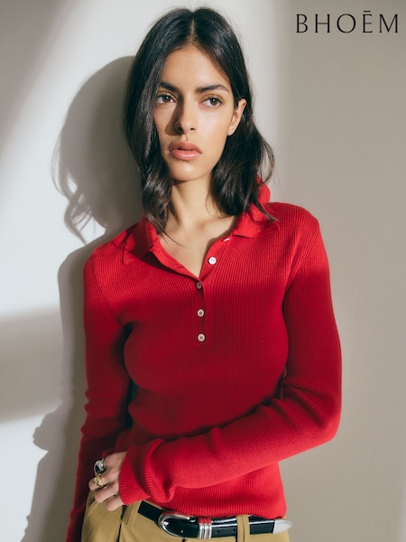 BHOEM Polo rouge en maille côtelée à manches longues